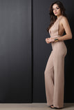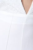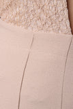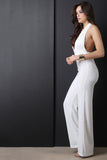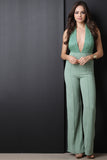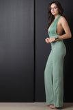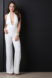 This sassy jumpsuit features a deep v neckline, halter top cut, 3 button closure at nape, lace contrast top, high waist cut bottom, pin tuck detailing, flare cut legs, invisible zipper closure at back waist. Accessories sold separately. Self: 100% Polyester. Contrast: 90% Nylon, 10% Cotton.