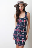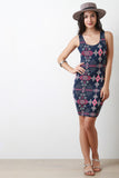 This cute bodycon dress features a soft knit fabrication, scoop neckline, sleeveless design, with a pop tribal print pattern and a mini hemline. Accessories sold separately. Made in U.S.A. 100% Rayon
