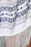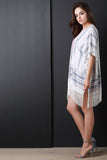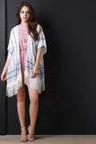This poncho features woven fabrication, leaf and flower style stripe print, kimono style sleeve, open front, square cut and a fringe trim hem. Accessories sold separately. 50% Polyester, 50% Cotton