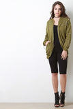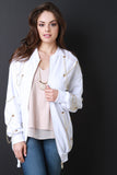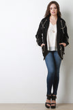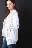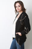 This longline jacket features thick knit, rib knit trim, zip-up front, chain accents throughout, and two pockets. Accessories sold separately. 65% Cotton, 35% Polyester.