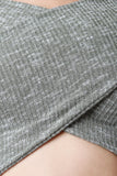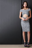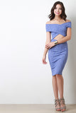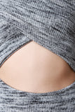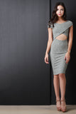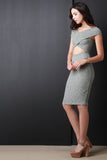 This sexy dress features a soft rib knit fabrication, off the shoulder neckline, cross over top, midriff cut out, and a knee length skirt with a bodycon silhouette. Accessories sold separately. Made in U.S.A. 97% Cotton 3% Spandex.