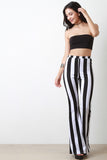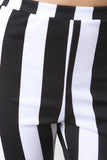 This bold pants features a high waist elastic waistband, knit fabrication, black and white stripe print, and a flare cut pant. Accessories sold separately. Made in U.S.A. 95% Polyester 5% Spandex.