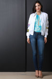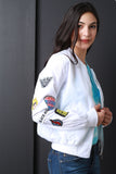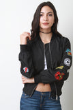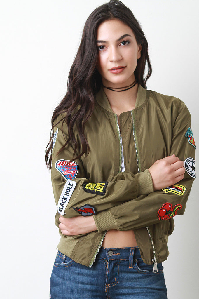 This bomber jacket is windbreaker silhouette, featuring, rib knit trim, zip up front, and snap button closure side pockets. Finished with side patches along the arms. 100% Polyester.