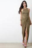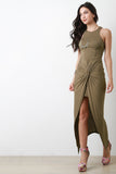 This dress features a round neckline, sleeveless design, twisted knot accent at front, racerback with exposed zipper closure, and stretchy sculpture fit. Partially lined. Accessories sold separately. 95% Rayon, 5% Spandex.
