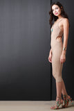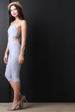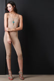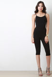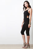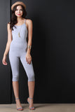 This jumpsuit features a knit fabrication, spaghetti straps, double back cross over design, side cut outs, tapered knee length pants and a curve hugging fit. Accessories sold separately. Made in U.S.A. 95% Cotton, 5% Spandex.