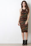 This knit midi dress features an asymmetrical racerback, mock neckline, stretchy sculpture fit, and camouflage pattern print. Accessories sold separately. Made in U.S.A. 98% Rayon, 4% Spandex.
