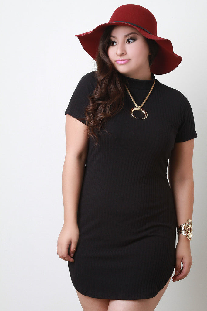 This plus size curve hugging mini dress is tee silhouette; featuring a mock neck, short sleeves, and curved hemline bodice. It is ribbed structure. Unlined. Accessories sold separately. 47% Polyester. 47% Cotton. 6% Spandex.