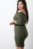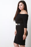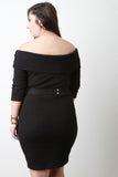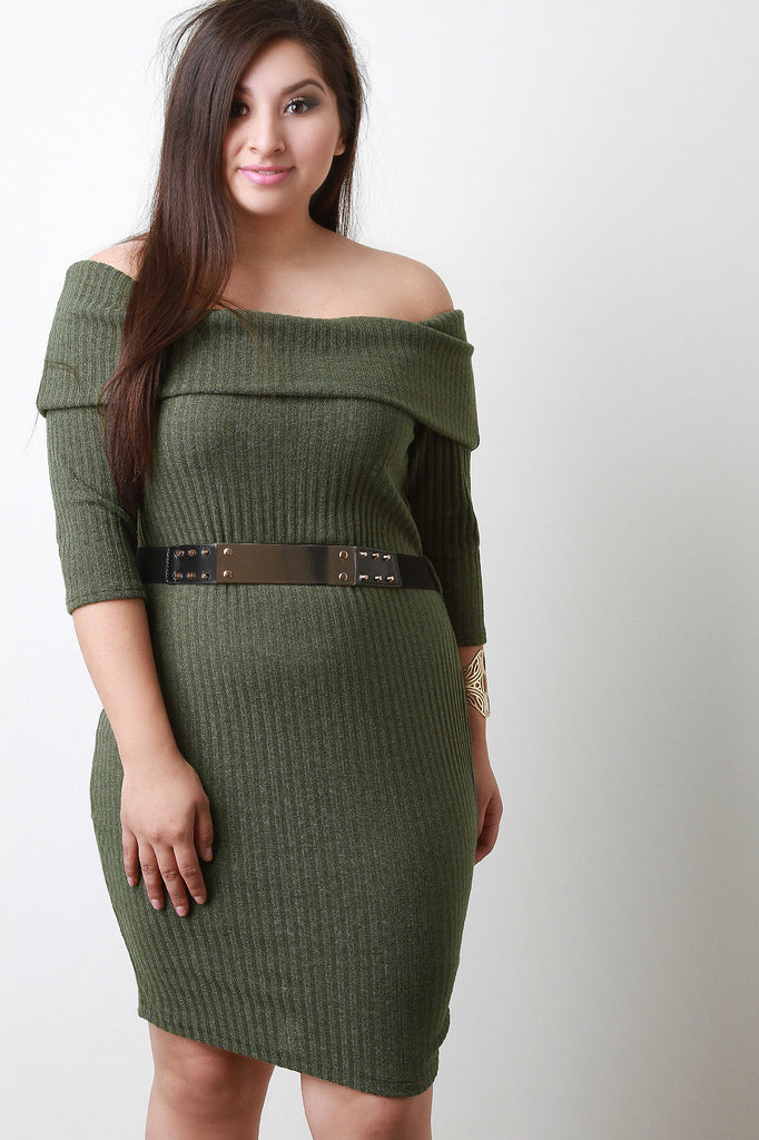A plus size ribbed knit dress featuring a foldover off-the-shoulder design, three-quarters sleeves, and a bodycon fit with slightly ruched sides at the hem. Includes metallic plate belt with stud accents, elastic construction, and double snap button closure. Other accessories sold separately. 96% Polyester, 4% Spandex.