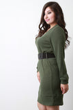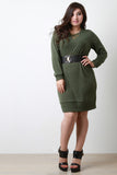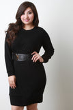 This plus size shift sweater dress features a round neckline, long cuffed sleeves, and a wide ribbed hem. Dress includes belt loops and a wide belt with an elastic construction, vegan leather front, and glossy gold-tone hook and loop design at the front. Other accessories sold separately. Made in U.S.A. 96% Polyester, 4% Spandex.