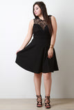 A floral lace back. Finished with a textured flared skirt. Accessories sold separately. Made in U.S.A. Self: 95% Polyester, 5% Spandex. Contrast: 97% Nylon, 3% Spandex.