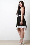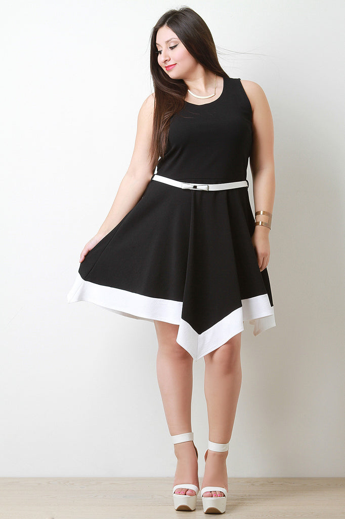 This gorgeous plus size fit & flare dress features a round neckline, sleeveless design, and contrasting handkerchief hem trim. Dress come with removable tuxedo bow accent vegan leather belt. Other accessories sold separately. Made in U.S.A. 96% Polyester, 4% Spandex.