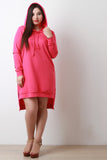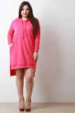 A plus size high-low dress featuring a drawstring hood, long sleeves, and side pockets. Accessories sold separately. 35% Cotton, 60% Polyester, 5% Spandex.