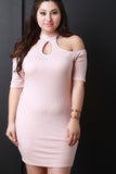 A plus size ribbed knit dress featuring a mock neckline, with cold shoulder three-quarters sleeves, and a keyhole front. Accessories sold separately. Made in USA. 96% Rayon, 4% Spandex.
