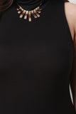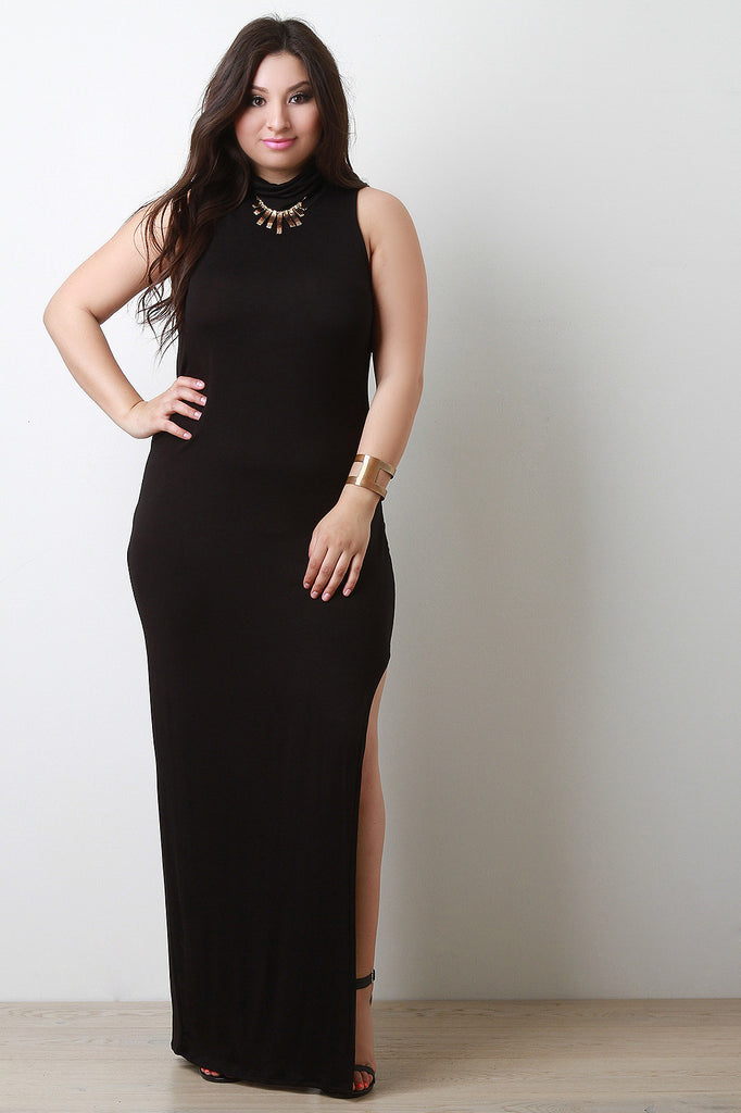 This plus size maxi dress is curve hugging with a side slit. Sleeveless and turtle neck design. Pull over style. Accessories sold separately. 95% Rayon. 5% Spandex. Made in U.S.A.