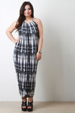 This plus size maxi dress features a halter neckline with adjustable tie at back, sleeveless design, high-cut slit at front, and assymetrical hemline. Accessories sold separately. Made in U.S.A. 95% Rayon, 5% Spandex.
