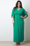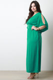 This plus size maxi dress features an empire waist band, v-neckline, and cold shoulder butterfly sleeves. Accessories sold separately. 95% Polyester, 5% Spandex.