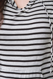 This plus size sleeveless striped jersey knit fabrication, v-neckline, attached hood with drawstring, front kangaroo pocket, and midi-length hem. Accessories sold separately. Made in U.S.A. 95% Rayon, 5% Spandex.