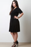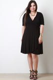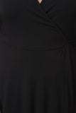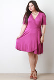 This plus size dress features a wrap inspired design with a surplice neckline, elbow sleeves, ties at waist, and midi-length flare skirt with overlapping front. Accessories sold separately. Made in U.S.A. 93% Rayon, 7% Spandex.