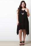 This trendy plus size dress features an embroidered T-back design, scooped neckline with spaghetti shoulder straps, and an asymmetrical handkerchief hemline. Accessories sold separately. 100% Rayon.