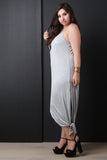 This plus size dress features a solid jersey knit fabrication, scoop neckline, two high side slits, and tie hemline for different looks. Finished with an open strappy back. Accessories sold separately. Made in U.S.A. 95% Rayon, 5% Spandex.