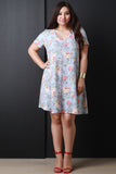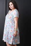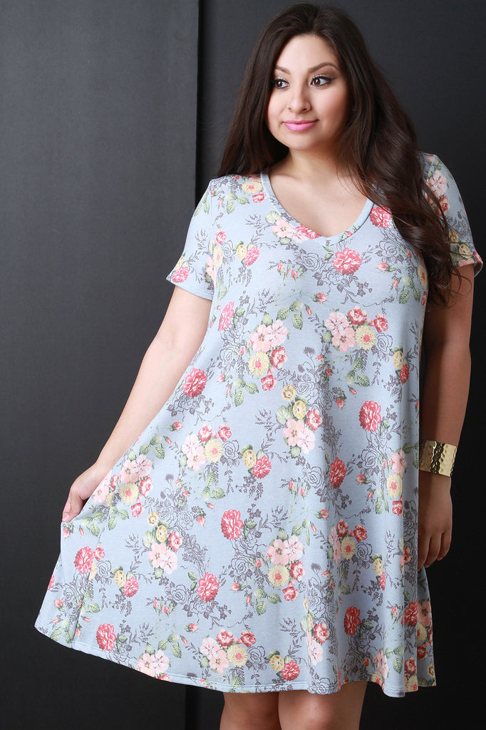 This plus size shift dress features a jersey knit fabrication, floral print throughout, round neckline, and short sleeves construction. Finished with a mini-length hemline. Accessories sold separately. Made in U.S.A. 62% Polyester, 33% Rayon, 5% Spandex.