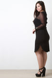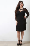 This plus size dress features solid knit main, contrast mesh, round neckline, cut out design, long sleeves, and back zipper closure. Accessories sold separately. 65% Rayon, 30% Nylon, 5% Spandex. Contrast: 90% Nylon, 10% Spandex.