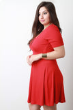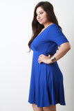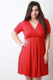 This dress features a ribbed knit fabrication, deep v-neckline and back, surplice faux wrap style, quarter sleeves, and elasticized cinched high waistline. Finished with a mini-length hemline. Accessories sold separately. Made in U.S.A. 71% Rayon, 25% Nylon, 4% Spandex.