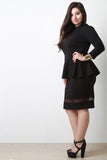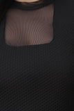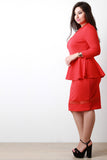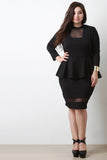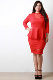 This plus size dress features a mock neck, mesh contrast cut outs, three quarter sleeves, peplum detail, textured knit fabrication, finished with a back keyhole and button closure at nape. Accessories sold separately. Made in U.S.A. 95% Polyester, 5% Spandex.