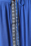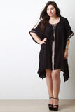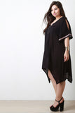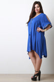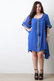 This lovely plus size peasant dress features a round neckline with faux drawstring closure, bell cold-shoulder sleeves with crochet lace insets, vertical embroidery design at front, and asymmetrical sharkbite hem. Accessories sold separately. 100% Rayon.