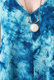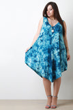 This plus size dress features a flowy knit fabrication, deep v-neckline, sleeveless fit, tie dye print throughout, and finished with an asymmetrical hemline. Accessories sold separately. Made in U.S.A. 95% Viscose, 5% Spandex.