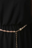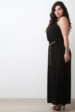 This chic plus size dress features a high neckline, spaghetti straps, single knee high slit, elastic waist, beck keyhole with button closure at nape, gold tone chain belt included. Other Accessories sold separately. 100% Polyester.