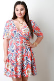 This dress features a stretchy knit fabrication with vibrant floral print, deep surplice v-neckline, and short sleeves fit. Finished with a high waist design. Accessories sold separately. Made in U.S.A. 95% Cotton, 5% Spandex.