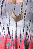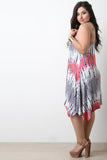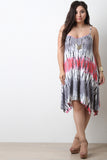 This plus size midi dress features a soft jersey knit fabrication with tie dye print, spaghetti shoulder straps, and sharkbite hemline. Accessories sold separately. 97% Rayon, 3% Spandex.