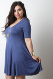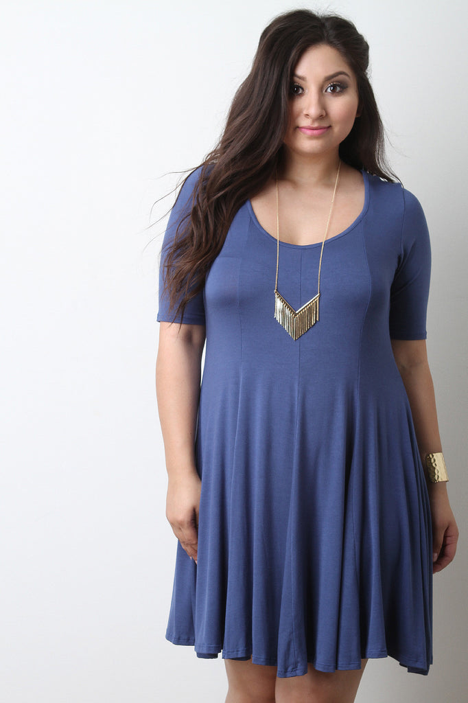 This flattering plus size shift dress features a soft jersey knit fabrication with seams detail, scooped neckline, elbow sleeves design, and flowy skirt. Accessories sold separately. 97% Rayon, 3% Spandex.