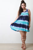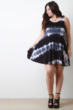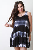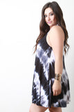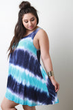 This plus size shift dress features a sleeveless design features a soft knit fabrication , tie dye coloring, sleeveless design, scoop neckline, and a flare cut mini length hemline. Accessories sold separately. Made in U.S.A. 95%Rayon, 5% Spandex.