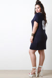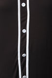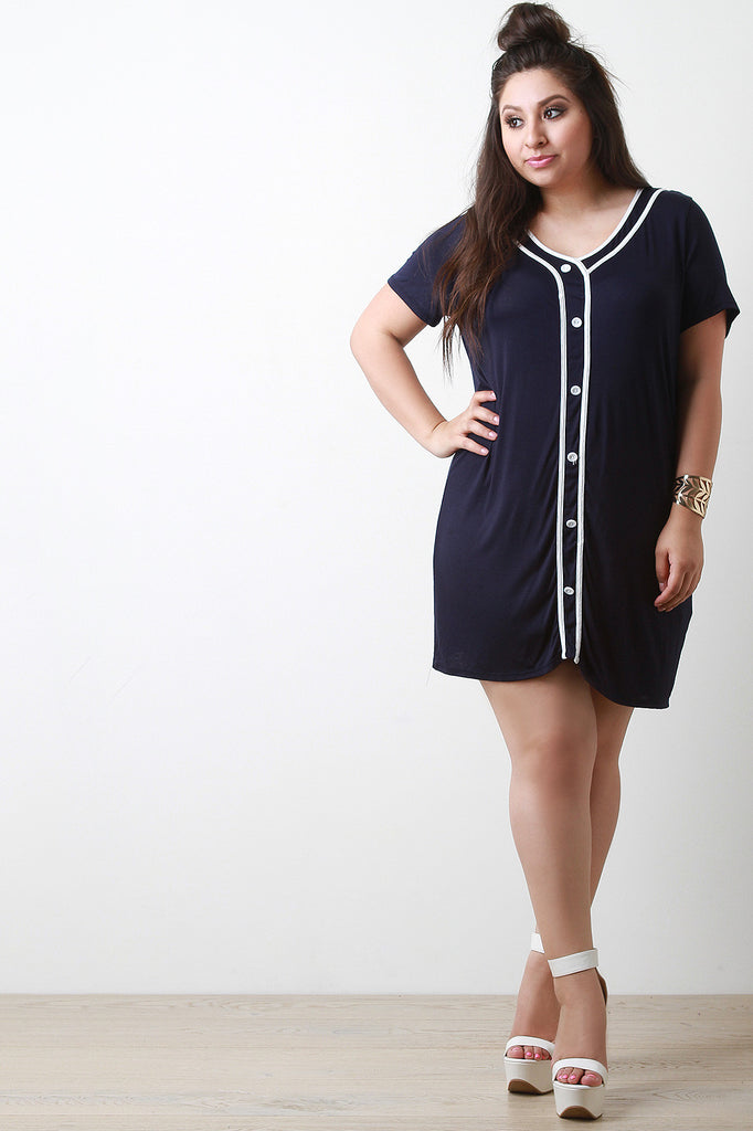 This sporty plus size dress features a v neckline, contrast trim, faux button up front, soft knit fabrication, short sleeves mini length hem, and the number "99" graphic print on the back. Accessories sold separately. Made in U.S.A. 95% Rayon, 5% Spandex.