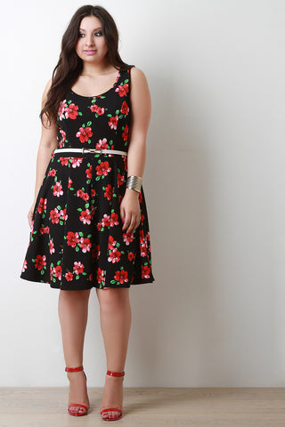 Floral Scoop Neck Sleeveless Belted Fit And Flare Dress