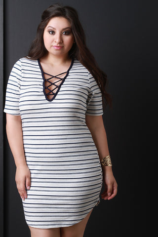Lace Up V Neck Striped Tee Shirt Dress