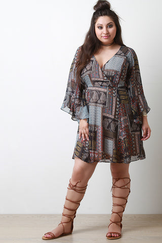 Paisley Print Surplice Bell Sleeve Dress