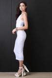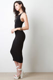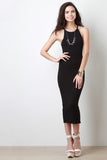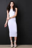 This lightweight sleeveless dress features a ribbed knit texture knit, cutaway neckline, racer back, and midi length hemline. Accessories sold separately. Made in U.S.A. 95% Polyester, 5% Spandex.