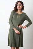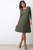 A shift dress features a soft/semi-faded knit fabrication along with a keyhole on the back with a button for closure, round neckline, and three quarter sleeves. Accessories sold separately. Made in U.S.A. 95% Rayon, 5% Spandex.