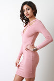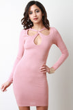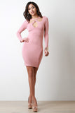 A soft mini dress featuring a twisted cutout yoke design, long sleeves, and bodycon fit. Accessories sold separately. Made in USA. 95% Polyester, 5% Spandex.