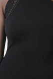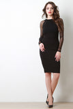 This  midi dress  features a round neckline, contrasting mesh long sleeves design, beautiful crochet trims, slit detail, and exposed back-zip closure. Accessories sold separately. Made in U.S.A. 62% Viscose, 33% Nylon, 5% Spandex. Contrast: 92% Spandex, 8% Spandex.
