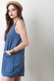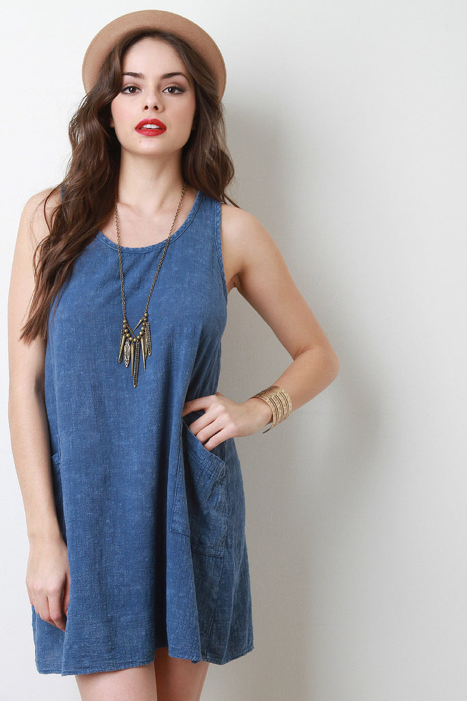 This sleeveless trapeze dress features a soft textured fabric, round neckline, and two front slip pockets. Accessories sold separately. Made in USA. 100% Cotton.