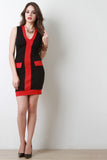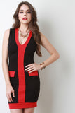 This stunning  mini sheath dress  features a colorblocked design, v-neckline, front faux pockets, and sleeveless construction. Finished with fitted bodice and pencil skirt. Accessories sold separately. Made in U.S.A. Self & Contrast: 68% Nylon, 28% Viscose, 5% Spandex.