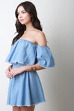 This chambray dress features a bardot neckline with elasticized band, short bell sleeves, and frayed hemline. Accessories sold separately. 100% Cotton.