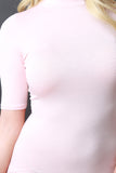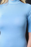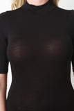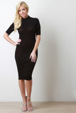 This form-fitting  midi dress  features soft jersey knit, mock neck, quarter length sleeves, and ruche detailing. Accessories sold separately. Made in U.S.A. 95% Rayon, 5% Spandex.