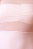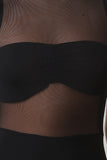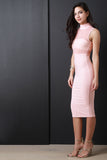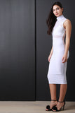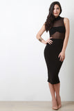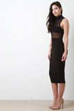 This sleeveless midi dress features a turtle neckline, keyhole back with double button closure, semi-sheer mesh fabrication at upper half, high waisted seam to a contrasting bottom half. Accessories sold separately. Made in U.S.A. 96% Polyester, 4% Spandex.