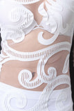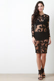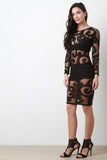 This bodycon dress features an filigree lace pattern on semi-sheer mesh fabrication, round neckline, long sleeves, back zipper closure and stretchy fit. Accessories sold separately. Made in U.S.A. 85% Polyester. 15% Nylon.