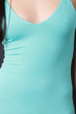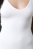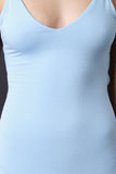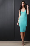 This casual dress features a soft stretchy knit fabrication, deep v-neckline, and crisscross back detail. Finished with a midi length hemline. Accessories sold separately. Made in U.S.A. 55% Polyester, 40% Rayon, 5% Spandex,